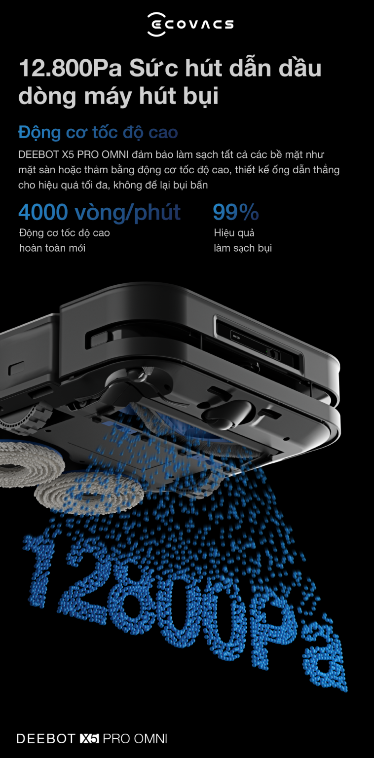 Điểm bức phá của Deebot X5 Pro OMNI chính là việc sở hửu lực hút khủng lên đến 12.800PA. Đây là chỉ số lực hút cao nhất trên thị trường hiện nay. Nhờ có lực hút siêu mạnh, tích hợp cùng động cơ tốc độ cao, và ống dẫn thẳng, đảm bảo làm sạch sâu mọi bề mặt, kể cả sàn cứng và thảm. Ngoài ra, nâng cấp chiều dài chổi chính 200mm, giúp tối ưu hiệu quả làm sạch lên 19%.