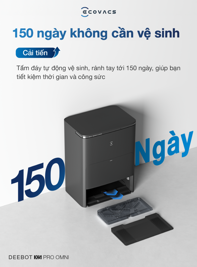 Một điểm mới mẻ tromng phiên bản DEEBOT X5 PRO OMNI chính là sự thiết lập hệ thống cấu trúc lọc, tự động làm sạch trong thời gian tới 150 ngày, chỉ yêu cầu vệ sinh 2-3 lần/năm, mang lại sự tiện lợi và an tâm cho người dùng.