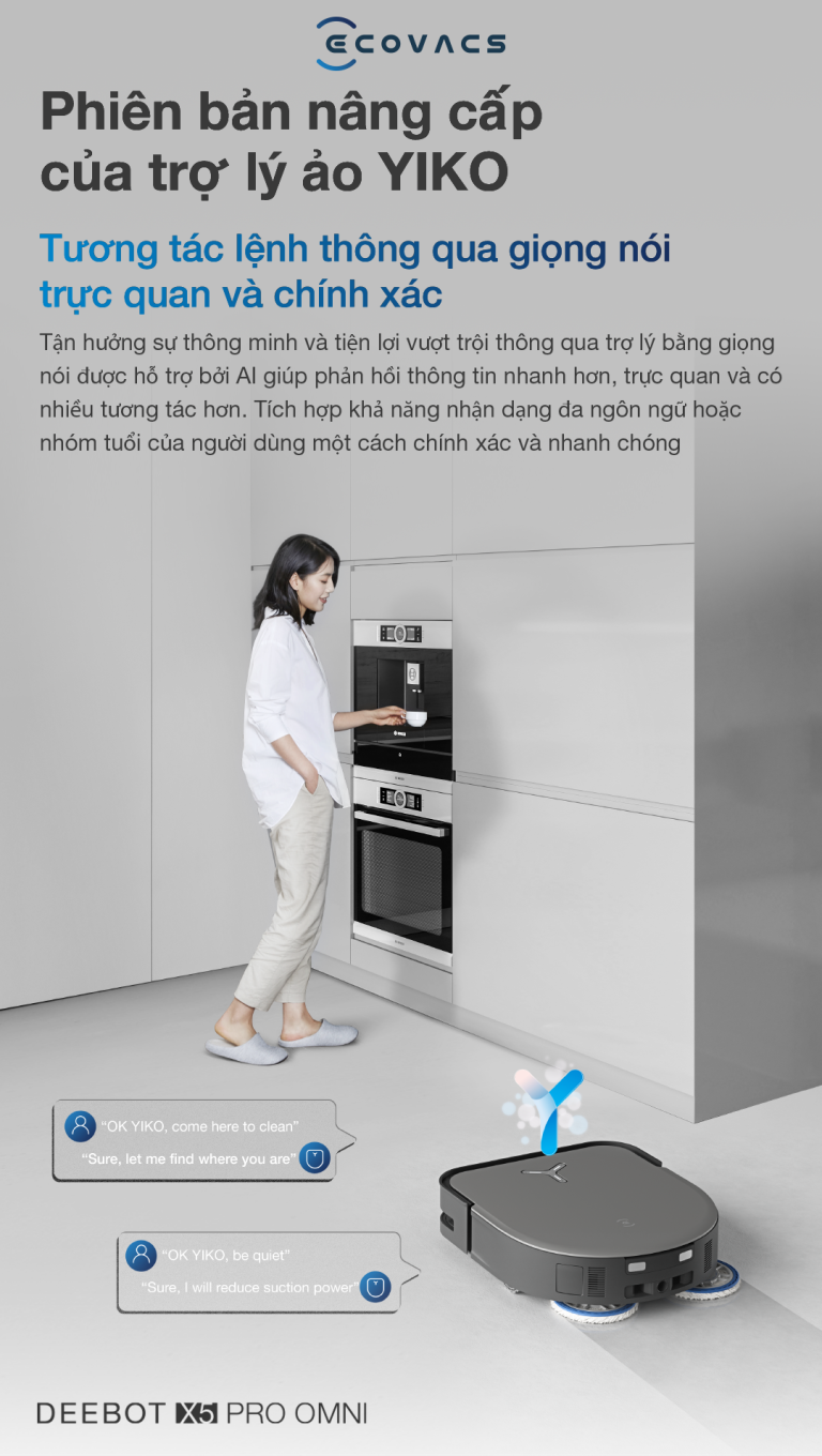 Trợ lý ảo YIKO AI được nâng cấp trong robot X5 Pro OMNI, bao gồm 6 phiên bản mới: hội thoại nhiều lượt, linh hoạt điều chỉnh tác vụ, thao tác trên Ecovacs Home, dọn dẹp theo lịch trình, NLP ngoại tuyến và tương tác nhiều lệnh.