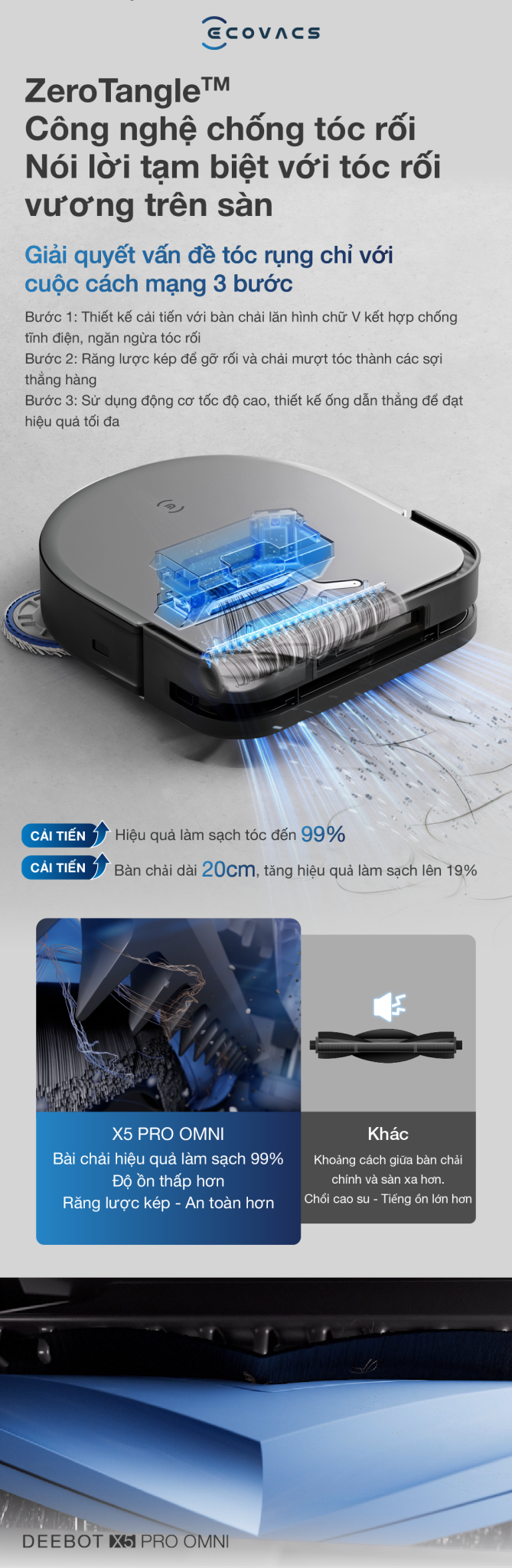 Tình trạng vướng tóc trong các phiên bản robot thế hệ trước khiến người dùng khó chịu thì nay đã được X5 Pro OMNI giải quyết triệt để nhờ công nghệ chống rối ZeroTangle, kết hợp lực hút mạnh kèm răng lược kép. Bên cạnh đó, thiết kế bàn chải con lăn mới mẻ, lông phẳng 21 độ, lông góc xoay ra ngoài, cho tỉ lệ rối tóc thấp tới 0%, và đồng thời tăng độ bền cho phụ kiện này.