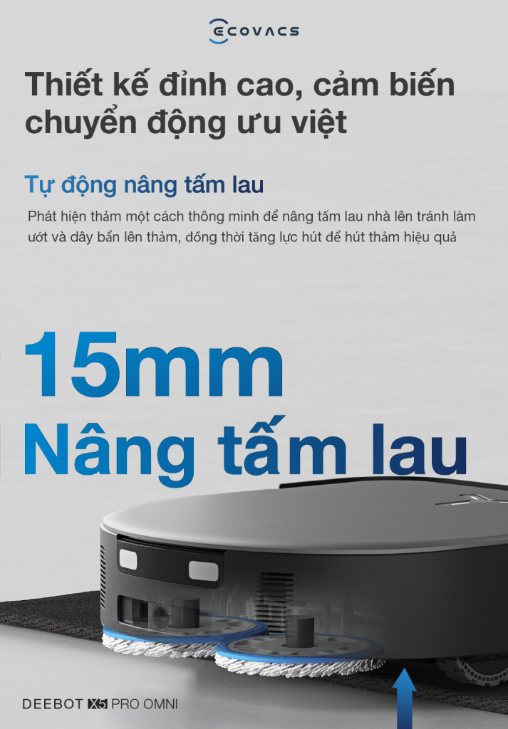 Công việc làm sạch thảm đã trở nên dễ dàng hơn nhờ tính năng nâng vải lau lên đến 15mm. Hệ thống lau nhà của X5 Pro OMNI tự động nâng các tấm lau lên khi phát hiện thảm. Tại thời điểm này, lực hút sẽ được điều chỉnh lên mức tối đa, tự ngắt chế độ lau, duy trì trạng thái sạch sẽ cho ngôi nhà của bạn, hạn chế lây nhiễm chéo một cách hiệu quả. .