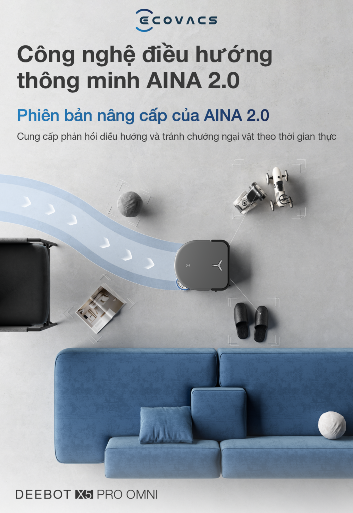 Robot hút bụi thông minh X5 Pro OMNI được áp dụng mô hình điều hướng lộ trình thông minh AINA 2.0, đánh dấu sự bức phá trong lĩnh vực phát triển robot của Ecovacs. Đây là hệ thống tránh chướng ngại vật lớn nhỏ khác nhau và điều hướng linh hoạt, cùng kết hợp với “công nghệ học sâu và học tăng cường”