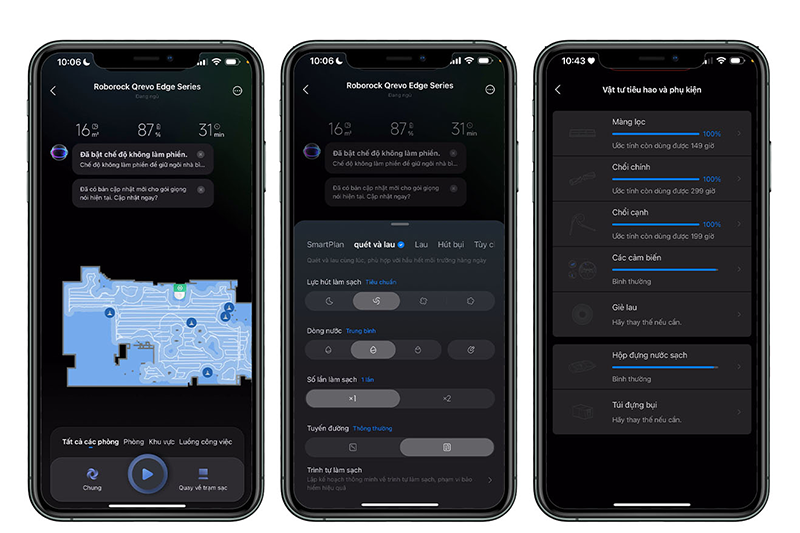 Bằng cách kết nối robot hút bụi Roborock Q Revo Edge 5V1 với ứng dụng Roborock, người dùng có thể theo dõi quá trình làm sạch dễ dàng thông qua điện thoại. Ứng dụng này hỗ trợ đầy đủ các tính năng như lên lịch dọn dẹp, thiết lập khu vực cấm, lưu và quản lý bản đồ nhiều tầng, tạo bản đồ 3D sinh động và kích hoạt chế độ khóa trẻ em để đảm bảo an toàn khi có trẻ nhỏ trong nhà.