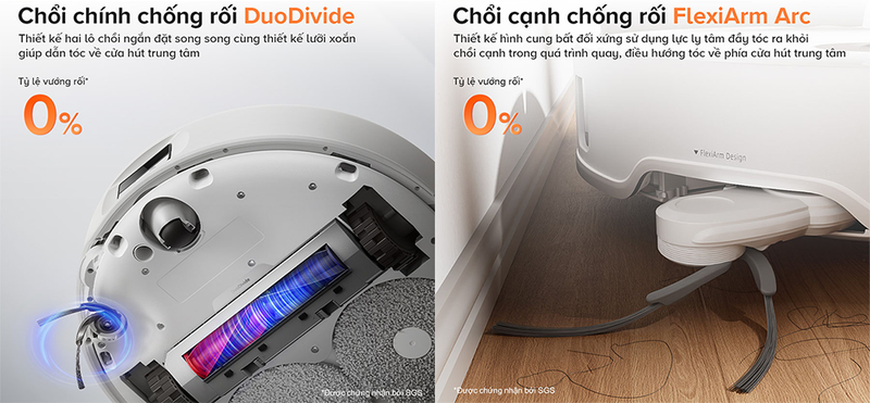Trong khi đó, chổi bên FlexiArm có dạng hình cung bất đối xứng, vận dụng lực ly tâm để tự động đẩy tóc ra khỏi chổi trong quá trình quay. Cơ chế này điều hướng tóc theo chuyển động tự nhiên, đẩy dần về phía đuôi và hướng thẳng vào chổi chính, hạn chế tình trạng rối tóc làm gián đoạn hoạt động của robot.