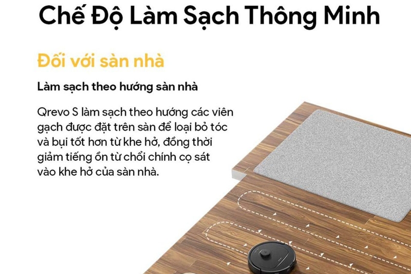 Thiết bị còn làm sạch theo hướng các viên gạch được đặt trên sàn, giúp loại bỏ tóc và bụi hiệu quả hơn từ các khe hở. Đồng thời, thiết kế này còn giúp giảm tiếng ồn do chổi chính cọ sát vào bề mặt sàn, mang đến trải nghiệm dọn dẹp êm ái và tối ưu hơn.