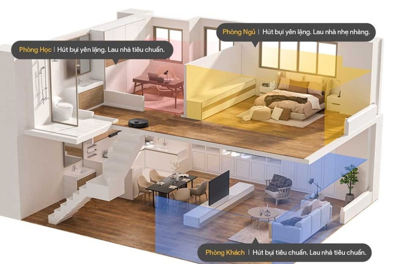 Kết hợp bản đồ 3D trực quan giúp người dùng dễ dàng theo dõi quá trình vệ sinh. Sản phẩm có thể lưu nhiều bản đồ khác nhau, phù hợp với nhà nhiều tầng. Ngoài ra, chế độ SmartPlan giúp tối ưu chương trình làm sạch theo từng loại phòng và loại sàn, tự động điều chỉnh chế độ hút bụi và lau nhà phù hợp. Ví dụ, phòng ngủ được làm sạch nhẹ nhàng với chế độ hút bụi yên lặng, phòng học giữ sự yên tĩnh với chế độ lau tiêu chuẩn, còn phòng khách được vệ sinh sâu hơn với lực hút mạnh. Đặc biệt, robot còn có thứ tự dọn dẹp thông minh, ưu tiên dọn phòng ngủ trước, sau đó đến phòng tắm và bếp.