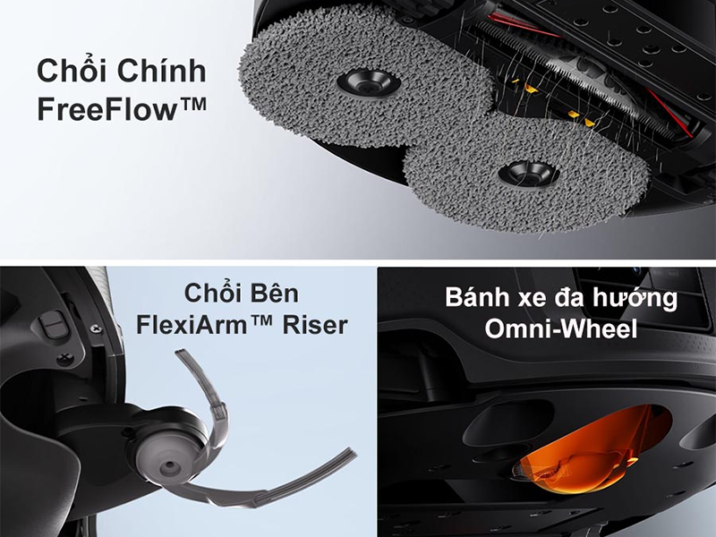 – Chổi bên FlexiArm Riser: Với khả năng nâng – hạ tự động và cấu trúc linh hoạt, chổi bên hoạt động hiệu quả ở các cạnh tường, góc hẹp mà vẫn giữ tỷ lệ rối tóc gần như bằng 0%, đảm bảo hiệu quả làm sạch tối đa mà không cần can thiệp thủ công thường xuyên.