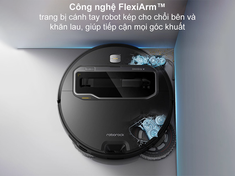 Roborock Saros Z70 sở hữu công nghệ FlexiArm với cánh tay kép dành cho cả chổi bên và khăn lau. Thiết kế này sẽ mở rộng phạm vi tiếp cận đến các góc khuất, khe hẹp, cạnh tường và cả dưới nội thất. Hệ thống mang lại khả năng làm sạch toàn diện, không điểm mù, đảm bảo ngôi nhà được làm sạch từ trong ra ngoài.