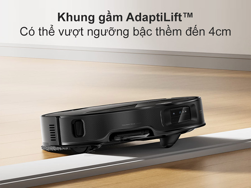 Không chỉ vậy, mẫu robot hút bụi lau nhà này còn được nâng cấp với khung gầm AdaptiLift thông minh, cho phép điều chỉnh độ cao độc lập từng bánh xe. Bạn có thể nâng toàn bộ robot hoặc tùy chỉnh từng bên để tự động thích ứng với địa hình phức tạp, như thảm dày, gờ cửa hay sàn không bằng phẳng.