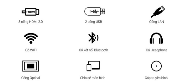 Casper 55UX6200 có 2 cổng HDMI, 2 cổng USB, cổng LAN, có WIFI, có Headphone, cổng Optical, chia sẻ màn hình, cáp truyền hình.