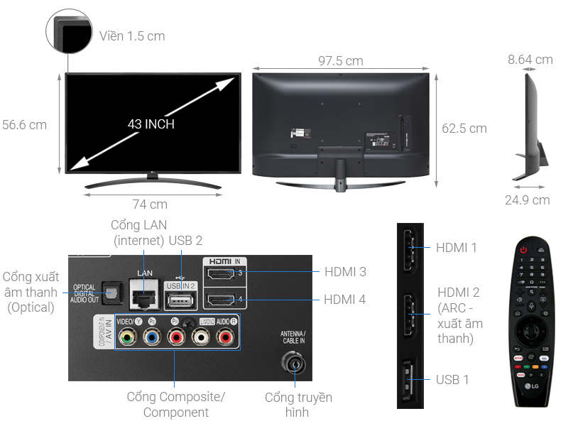 Tivi LG 43 inch với kích thước vừa phải có thể bố trí ở những không gian vừa và nhỏ như phòng khách, phòng ngủ,…