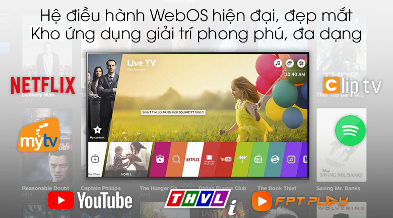 Hơn nữa, tivi còn được tích hợp kho ứng dụng giải trí sẵn có như: Youtube, Netflix, Trình duyệt web, LG Content Store,… Ngoài ra bạn cũng có thể tải thêm các ứng dụng khác như: FPT Play, ClipTV, Fim+, MyTV, Nhaccuatui, THVLi, HTV, Spotify, Zing TV… giúp mang thế giới giải trí đến ngay trong ngôi nhà của bạn.