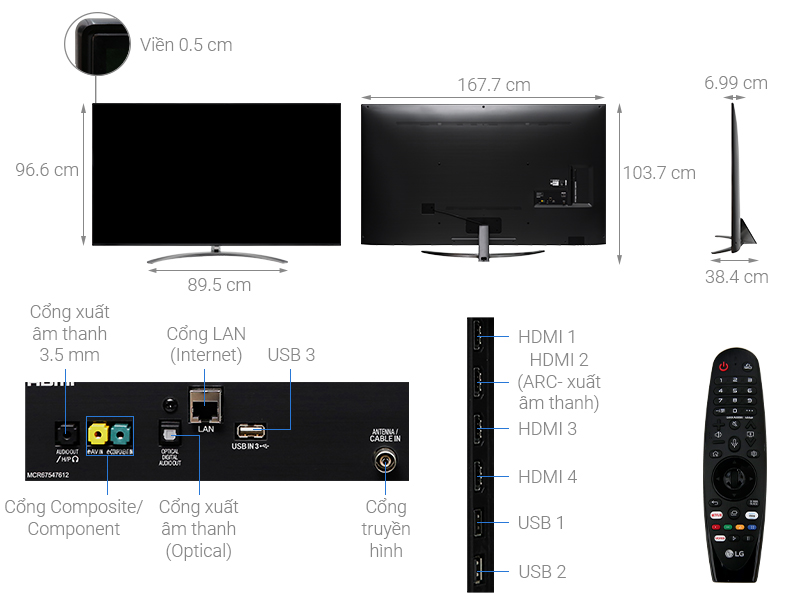 Smart Tivi LG 8K 75 inch 75SM9900PTA sở hữu thiết kế hiện đại cùng tông màu đen sang trọng hài hòa không gian nội thất trong căn phòng. Cùng với viền màn hình mỏng 0.5 cm, thậm chí còn mỏng hơn điện thoại iPhone X.