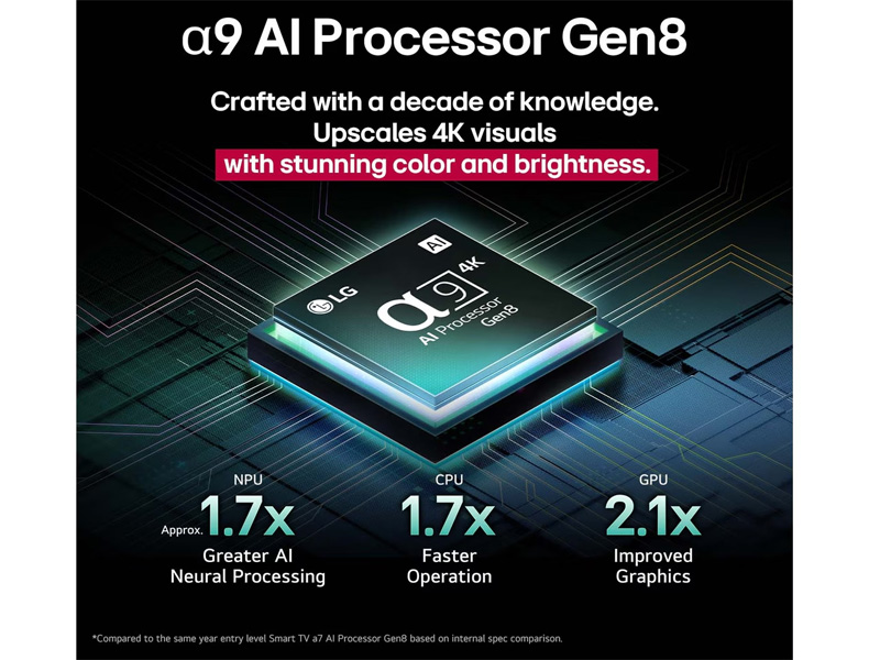 Bộ xử lý AI α9 Gen8 mang đến bước tiến vượt bậc về khả năng nâng cấp nội dung và tái tạo hình ảnh. Với công nghệ AI Super Upscaling, tivi tự động phân tích và nâng cấp những nội dung không đạt chuẩn 4K lên gần chuẩn 4K, cải thiện độ sắc nét, chi tiết và độ tương phản.