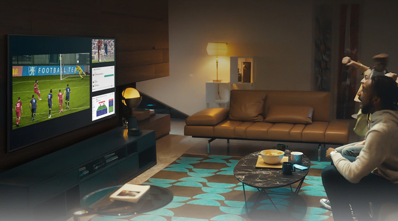 4 khung hình được chiếu đồng thời trên màn hình lớn của tivi SamSung QLED, cho bạn vừa xem bóng đá, vừa xem được tin tức liên quan, bảng thống kê tỉ số, trải nghiệm đa màn hình tuyệt vời hơn bao giờ hết.