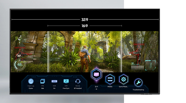 Super Ultra Wide Game View & Game Bar: Mở rộng khung hình cho tầm nhìn rộng với tỉ lệ khung hình 21:9 và 32:9. Menu Game Bar truy cập linh hoạt với 1 phím điều hướng cho bạn chỉnh nhanh các thông số cần thiết như tỉ lệ khung hình, FPS, HDR, kiểm tra độ trễ đầu vào,…