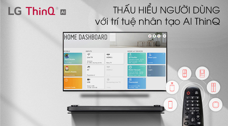 Tivi OLED LG với trí thông minh nhân tạo AI ThinQ đi kèm Magic Remote thông minh giúp bạn tương tác với tivi một cách tốt hơn. Nâng cao trải nghiệm điều khiển và tìm kiếm giọng nói trên tivi.
