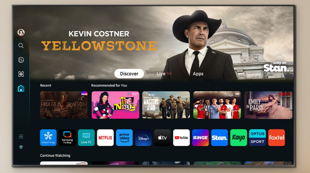 – Hệ điều hành Tizen™ của tivi Samsung có giao diện hiện đại, phần mục được sắp xếp thuận mắt, giúp bạn dễ dàng nhận diện và tìm kiếm nội dung yêu thích. Kho ứng dụng phong phú bao gồm các ứng dụng phổ biến như YouTube, Netflix, Clip TV, FPT Play, MyTV, VieON, Spotify và nhiều ứng dụng thú vị khác.