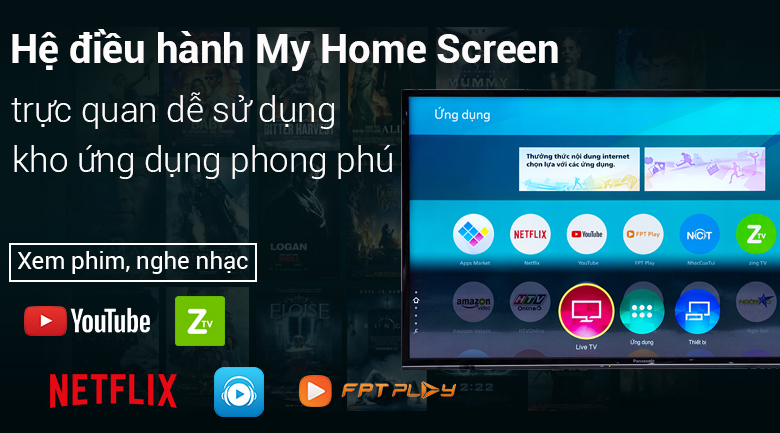 Tivi Panasonic này hỗ trợ nhiều ứng dụng giải trí quen thuộc như: Youtube, FPT Play, trình duyệt web,.. hoặc có thể tải thêm HTVC, MyTV Net, Nhạc của tui,… giúp bạn có thể tận hưởng những phút giây giải trí thoải mái sau khi làm việc căng thẳng.