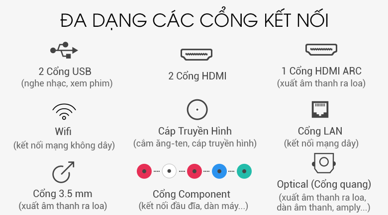 Tivi hỗ trợ bạn dùng được chuột, bàn phím và nhiều cổng kết nối thông dụng: HDMI, USB, Optical… để kết nối tivi với nhiều thiết bị ngoài như đầu đĩa, dàn âm thanh, laptop…