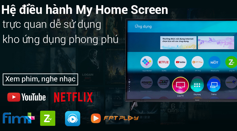 Smart tivi Panasonic sở hữu nhiều ứng dụng: Trình duyệt web, Ngoisao.net, VNExpress, Sohoa, Zing TV, Youtube… giúp bạn xem phim, nghe nhạc, lướt web sau những giờ làm việc căng thẳng.