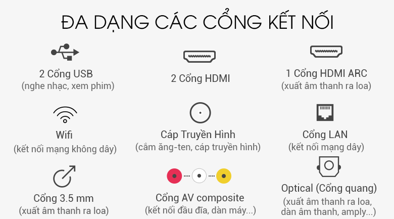 Smart tivi được trang bị các cổng kết nối thông dụng: HDMI, USB, Optical… giúp bạn kết nối tivi với nhiều các thiết bị ngoài như đầu đĩa, dàn âm thanh, laptop… để xem phim, nghe nhạc,…