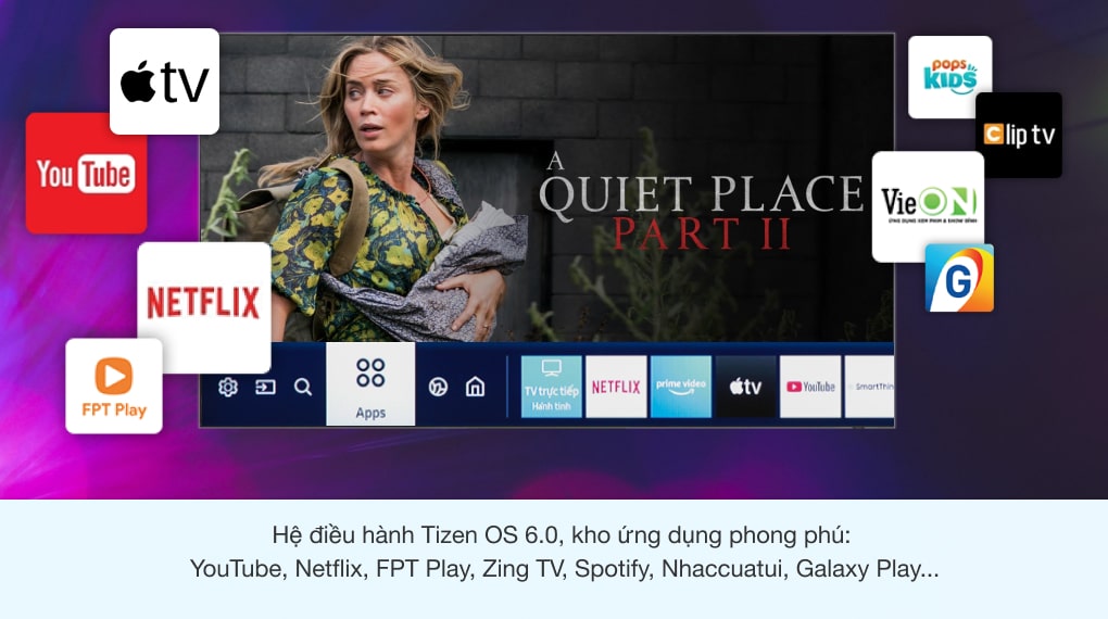 Với giao diện trực quan dễ dùng, các thành viên trong gia đình đều có thể dễ dàng sử dụng được. Cùng với đó là kho ứng dụng vô cùng phong phú như: Spotify, FPT Play, Galaxy Play, VTVCab ON, ClipTV,… bạn có thể thoải mái giải trí trên chiếc tivi Samsung QLED này.