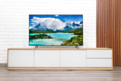 Kích thước tivi 49 inch vừa phải, thích hợp bố trí vào nhiều không gian nội thất khác nhau như phòng họp, phòng khác, phòng ngủ,… Chân đế dạng chữ V sáng bóng, chắc chắn, giúp tivi đứng vững trên nhiều dạng bề mặt phẳng khác nhau.