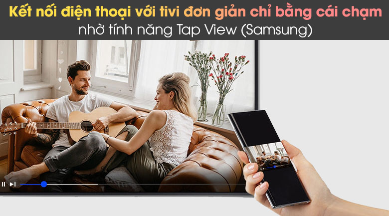 Bên cạnh tính năng chiếu màn hình AirPlay 2 phổ biến, thì chiếc Smart tivi này còn được trang bị tính năng Tap View với thao tác chiếu màn hình lên tivi đơn giản chỉ bằng cái chạm. Người dùng chỉ cần đặt điện thoại Samsung lên các cạnh tivi để nhận tín hiệu và từ đó đã có thể chia sẻ nội dung lên tivi dễ dàng.