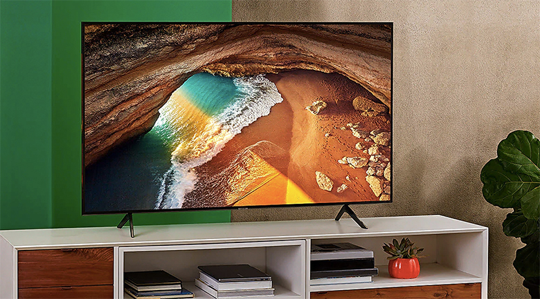 Smart Tivi QLED Samsung 4K 55 inch QA55Q65R có thiết kế tinh tế, chân đế kiểu chữ V ngược vững vàng trên mọi bề mặt phẳng.