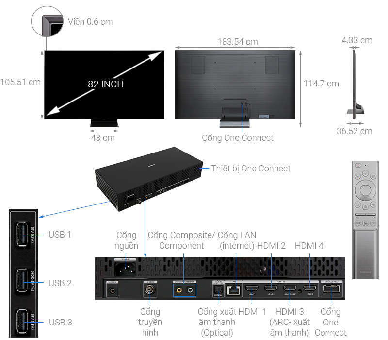 Kích thước tivi 82 inch tổng thể kiểu dáng hài hoà, liền mạch, thích hợp bố trí vào không gian nội thất rộng như phòng khách, phòng họp,…