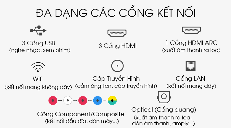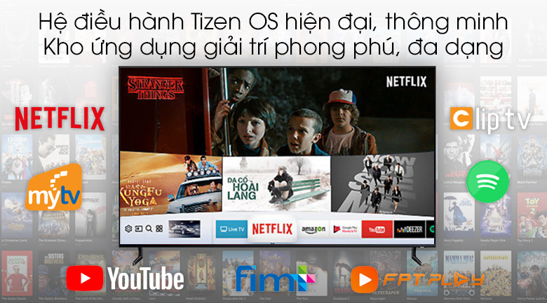 Tivi được trang bị kho ứng dụng phong phú các thể loại phổ biến như Netflix, Fim+, FPT Play, Clip TV, Zing TV, Nhaccuatui, Spotify, Apple TV, My TV, Youtube,… mang đến thế giới giải trí đa dạng, thú vị về ngôi nhà của bạn.