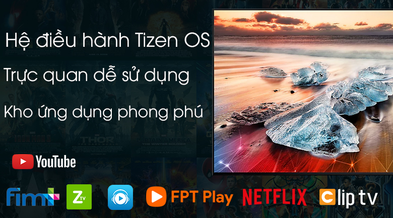 Smart tivi Samsung sử dụng hệ điều hành Tizen dễ sử dụng, giao diện thân thiện, đi kèm là hàng loạt ứng dụng phổ biến quen thuộc như: Youtube, Clip TV, Fim+, FPT Play,…
