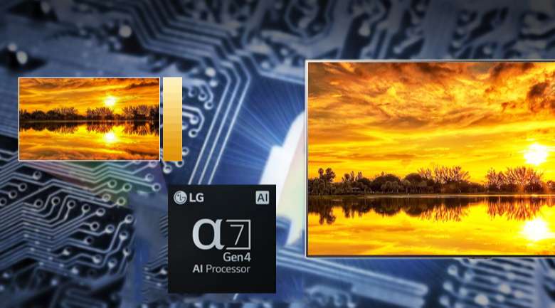 Bộ xử lý α7 Gen4 AI Processor 4K trên tivi LG này có khả năng tự động điều chỉnh hình ảnh hiển thị dựng trên các nội dung đã xem, ghi nhớ những hình ảnh đã xem để lần sau xử lý hình ảnh nhanh và chính xác hơn giúp nâng cấp chi tiết hình ảnh và giảm nhòe để hình ảnh sắc nét hơn.