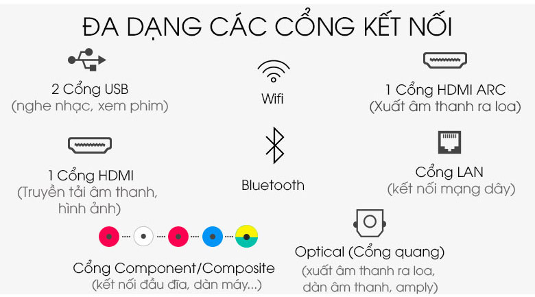 Hỗ trợ đa dạng cổng kết nối như Bluetooth, Wifi, HDMI, USB,…