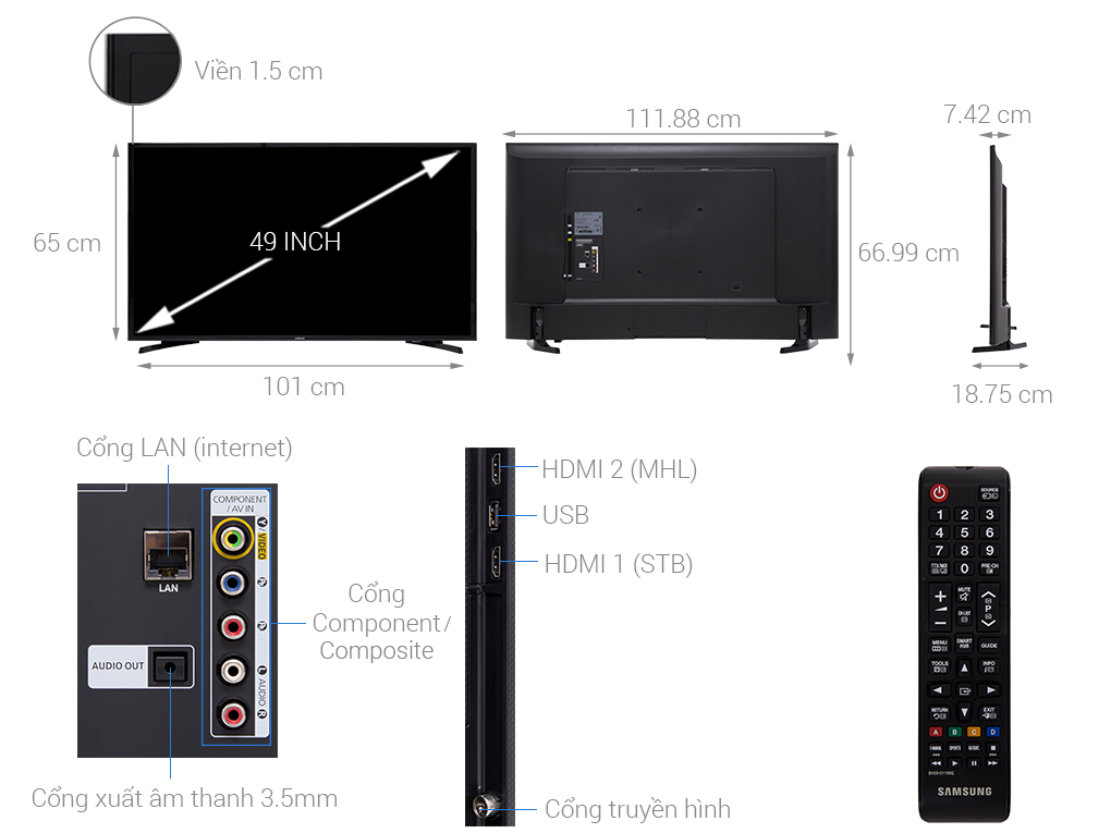 Kích thước tivi Samsung 49 inch rộng rãi, phù hợp với nhiều không gian bố trí trong nhà.