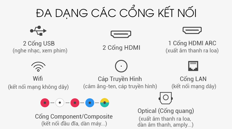 Smart tivi này được trang bị 3 cổng HDMI, 2 cổng USB, cổng LAN, WIFI giúp tivi nhà bạn có thể kết nối với nhiều phương tiện bên ngoài cùng một lúc như: loa, internet, laptop, USB…