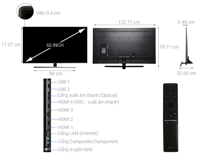 Smart Tivi Samsung 55 inch rộng lớn, đi kèm với thiết kế 360° hoàn hảo, hài hòa với mọi căn phòng trong ngôi nhà bạn. Chiếc TV trở thành một phần của không gian sống đẳng cấp nhờ vào thiết kế mỏng hiện đại, thích hợp bố trí vào phòng khách, phòng ăn.