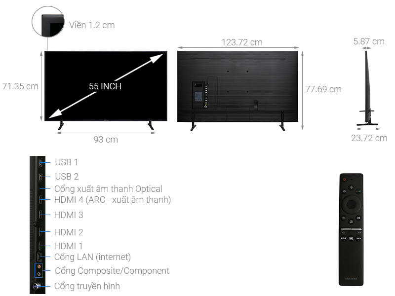 Kích thước màn hình tivi 55 inch mang lại trải nghiệm xem thoải mái, thích hợp bố trí vào không gian nội thất rộng như phòng khách, phòng họp,… Ngoài ra, tivi Samsung này còn có chân đế chắc chắn, giúp đứng vững trên nhiều dạng bề mặt phẳng khác nhau.