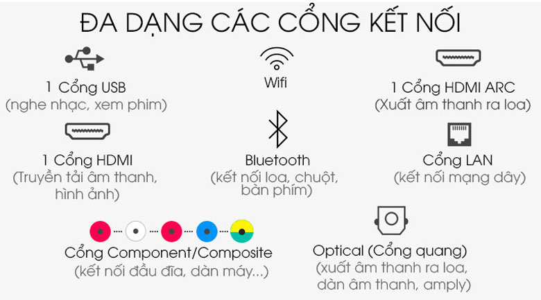 Hỗ trợ đa dạng cổng kết nối như Bluetooth, Wifi, HDMI, USB,…