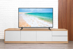 Chiếc tivi 65 inch có kích thước màn hình lớn, đặt trên chân đế vững chắc trên mọi bề mặt phẳng.