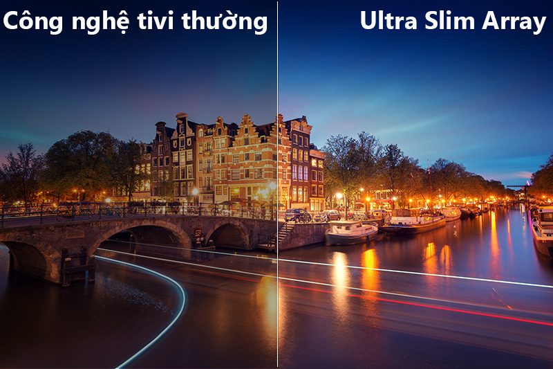 Với công nghệ Ultra Slim Array trên tivi Samsung bạn sẽ cảm nhận được từng chi tiết vượt ra khỏi giới hạn khung hình với các mức độ tương phản sâu. Ultra Slim Array điều chỉnh ánh sáng đèn nền, cho sắc đen sâu thẳm và sắc trắng sáng rõ hơn.