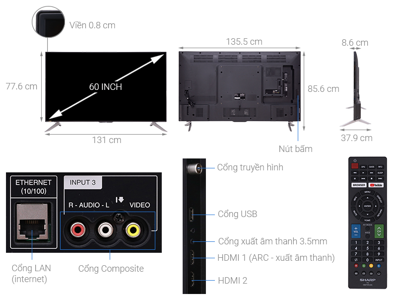 Tivi Sharp với kích thước màn hình 60 inch rất thích hợp bố trí và sử dụng tại các không gian như phòng khách, phòng họp, hội nghị hoặc cũng có thể dùng treo tường ngay tại phòng ngủ.