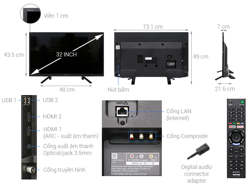 Tivi Sony 32 inch sở hữu các kết nối cơ bản như: HDMI, USB,… giúp bạn kết nối với đầu đĩa, laptop, dàn âm thanh,… lên tivi một cách dễ dàng.