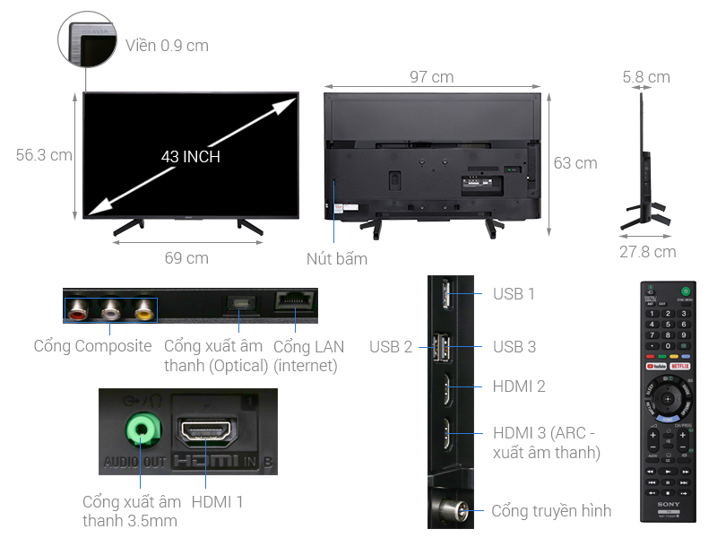 Tivi có kích thước màn hình vừa phải 43 inch rất thích hợp với những gian phòng như phòng khách, phòng họp nhỏ,… hay là treo tường ở phòng ngủ.