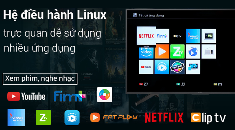 Smart tivi Sony này được trang bị các ứng dụng quen thuộc như: FPT Play, Fim+, Zing Mp3, Zing TV,…