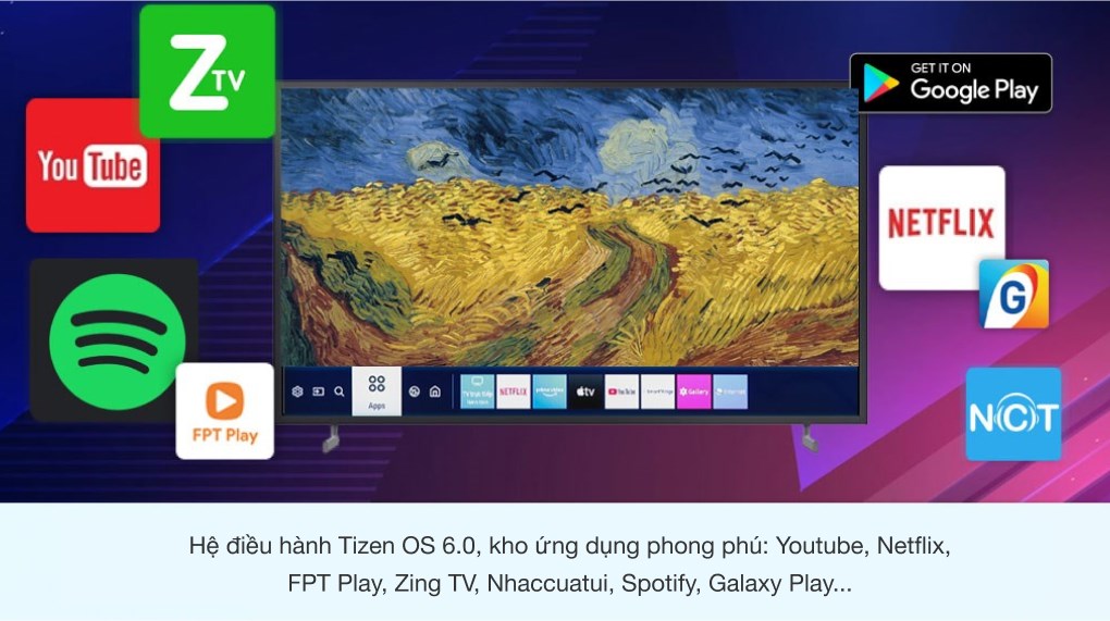Với thiết kế giao diện trực quan, giúp bạn dễ dàng theo dõi và tùy chọn các ứng dụng, chức năng thuận tiện sử dụng hàng ngày. Kho ứng dụng trên máy cũng rất đa dạng với ứng dụng giải trí như: YouTube, FPT play, VieON, Zing Mp3, Spotify, Clip TV, Galaxy Play, Netflix,… phục vụ tốt cho mọi nhu cầu trải nghiệm của cả gia đình bạn.