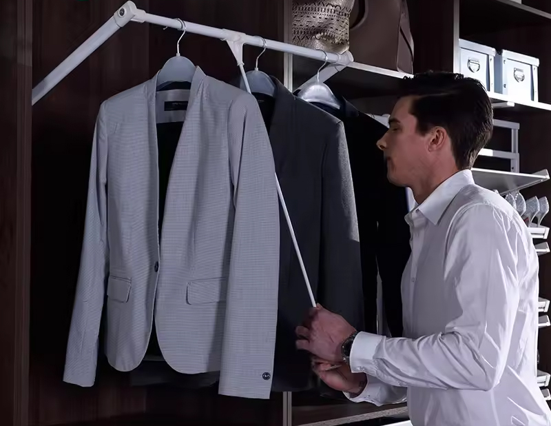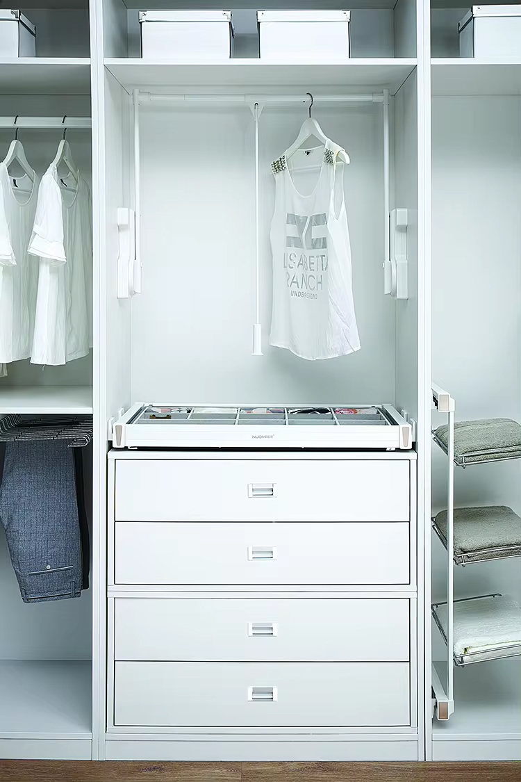 Không chỉ riêng đối với những chiếc tủ có chiều cao chạm tới trần nhà mà cả những chiếc tủ có khoảng không phía trên rộng và chưa được tận dụng hết đều nên bố trí lắp đặt thêm giá mắc di động để tận dụng tối đa không gian tủ đồng thời tăng diện tích lưu trữ quần áo lên một cách đáng kể.
