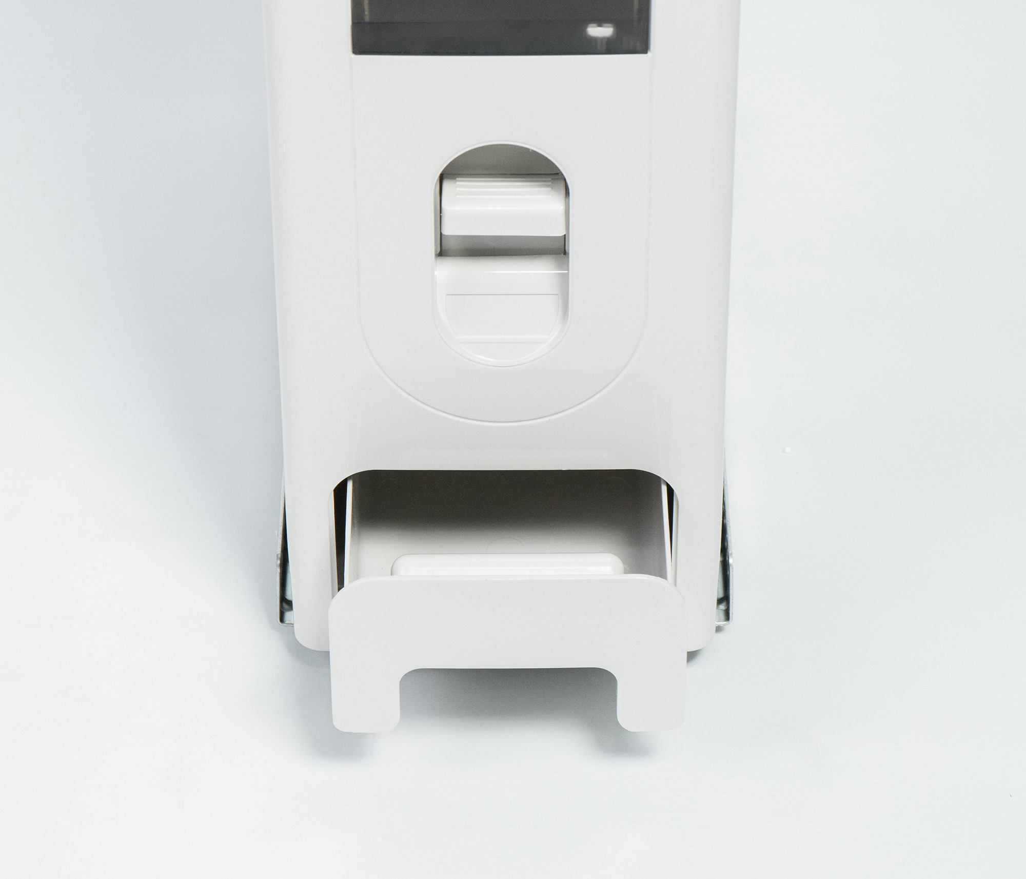 Thùng gạo Eurogold B17 còn có thêm khay hứng nhựa rộng ở phía trước thùng. Nếu như trước kia thường phải đong gạo bằng ca nên mỗi khi lấy gạo phải cúi người, với tay vào trong thùng và phải đong nhiều lần. Như vậy rất bất tiện và vất vả. Giờ đây với khay nhựa rộng bạn có thể lấy 600 g gạo/1 lần đong, bạn chỉ cần lấy gạo và đổ vào nồi nấu luôn.