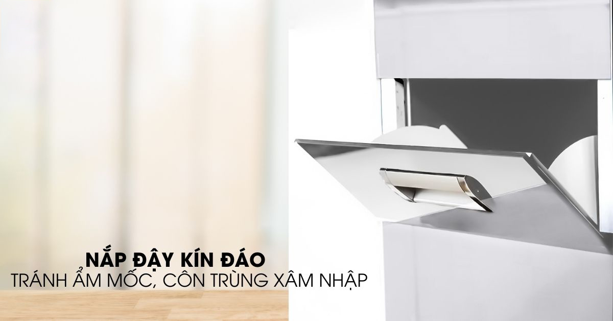 Nắp đậy kín đáo bảo quản gạo tránh ẩm mốc, côn trùng